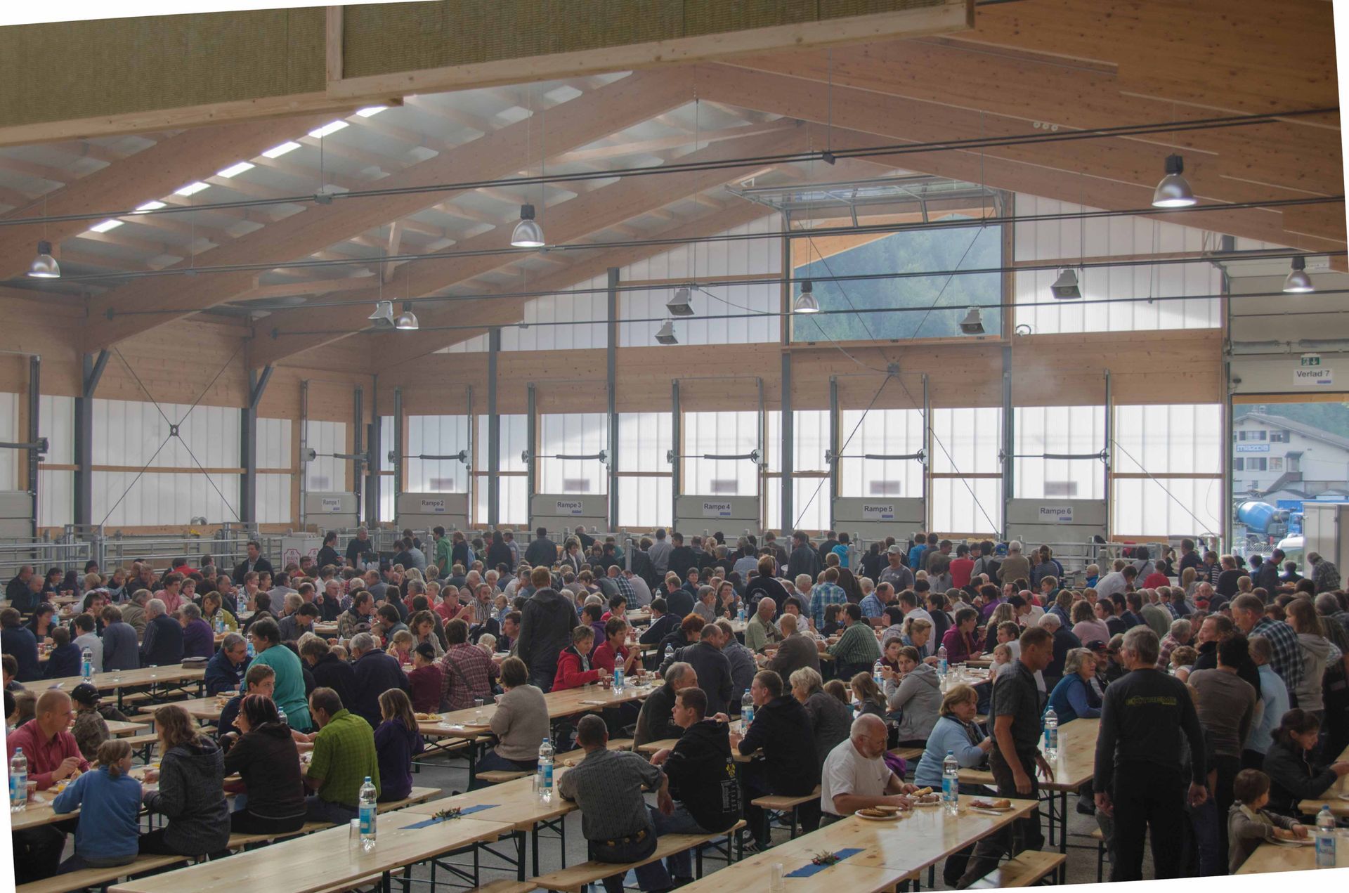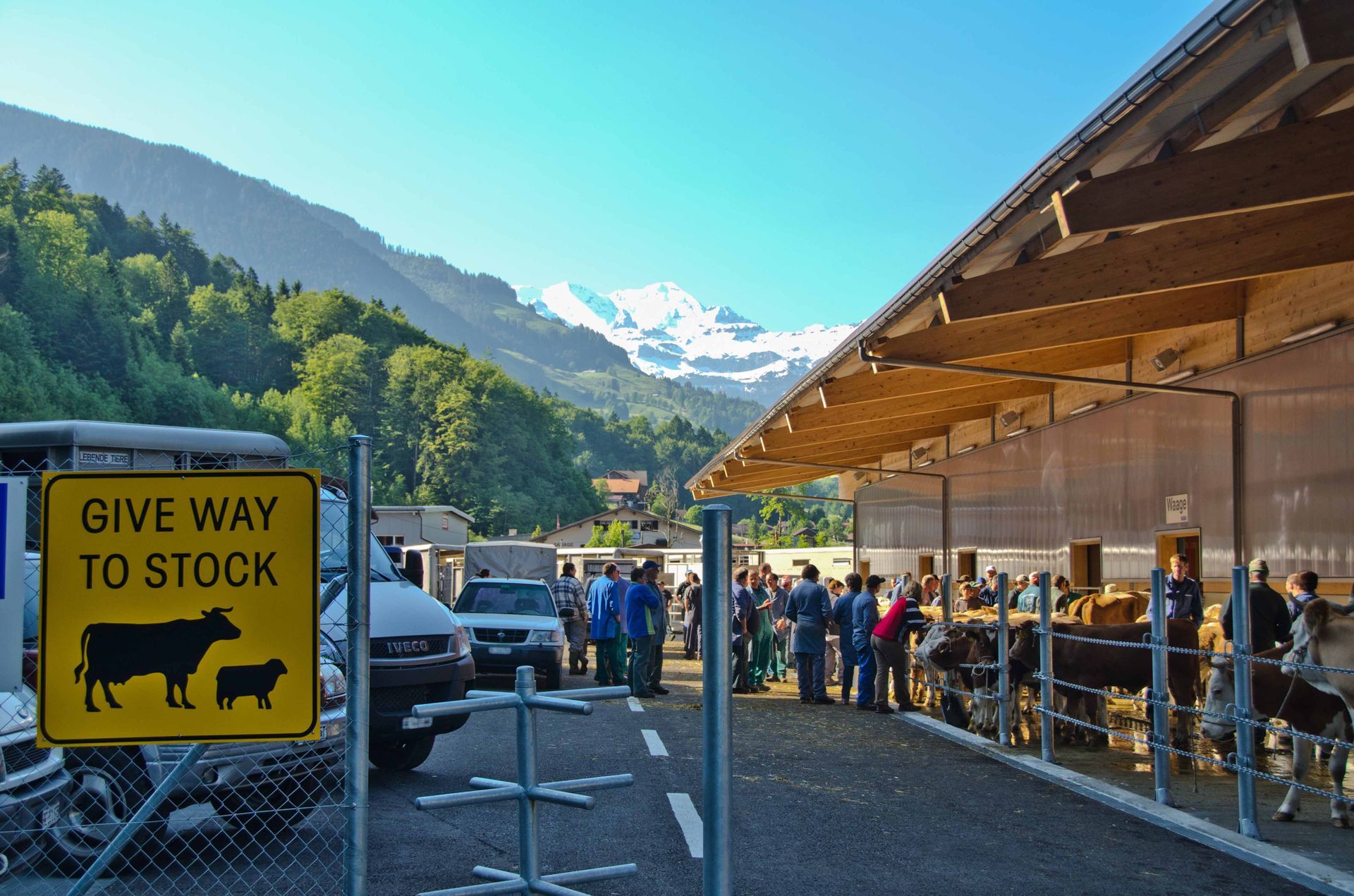 Ein bis zweimal pro Monat bringen Bauern, auch von weiter her, ihre Rinder in die neue Markthalle. Von dort werden die Tiere einzeln durch den achteckigen, drei Stockwerke hohen Blockbau der ‘Kander-Arena’ geführt, in der die Versteigerungen stattfinden. Danach hat jeder die freie Wahl, im Steakhouse eine anständige Mahlzeit zu geniessen oder hier an der Bar bei einer Stange ‘Rugenbräu’ Kontakte zu pflegen.